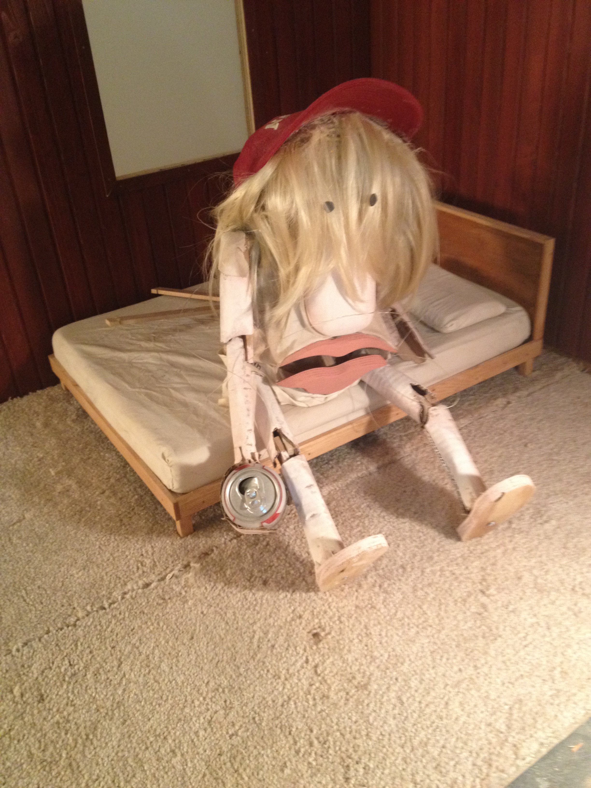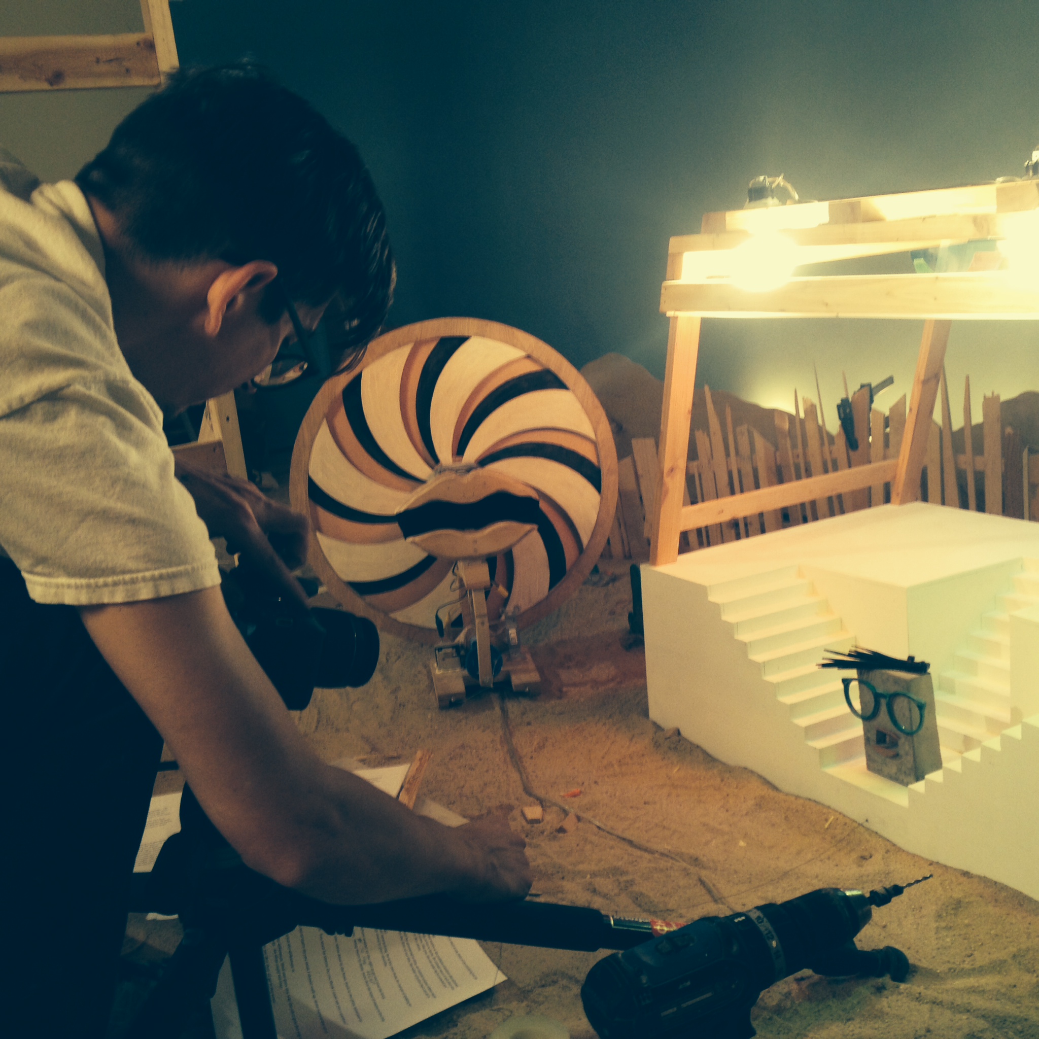 3 rooms full of sculpture, a marionette, and two people comprised our crew to film Steven. With a script of scene outlines and a few pages of dialogue, our approach was to explore the possibilities of each object within this framework. This would leave huge room for experimentation and improvisation. So I dusted off the old puppet arms and used a marionette for the first time. A few years ago I performed puppet shows for children, and had a blast using these Muppet-style characters then enjoying some sugary birthday cake. But Steven’s body is made of cardboard and wood, making it much clunkier than a hand puppet, and the operation more meticulous. There was a string for the mouth, two for the hip joints, and two for the arms. In experimenting and shooting, scene by scene, I found I had to meet the puppet in the middle. It’s body already had a certain way of expressing, and I had the task of bringing it to life. For most of the shoot, I stood on a 6-foot tall scaffolding, using 12-foot strings to make Steven walk and talk. I watched Nick construct it in about 10 minutes flat, using the 2 by 4’s we’d bought earlier that week. My heart was in my throat for a minute, but I had no other option. It’s just a game of balance, I told myself, and another classic acting allegory in my everyday life. I told myself, “If you let yourself get nervous, then you will get nervous.” It was so much fun. Sometimes my head knocked into the dusty fluorescent fixtures that hung from the ceiling. Sometimes he moved the whole structure while I was still sitting on it. It was all in the spirit of DIY, a work philosophy of my brother’s that allows for great margins for error, as well as great leaps of faith.