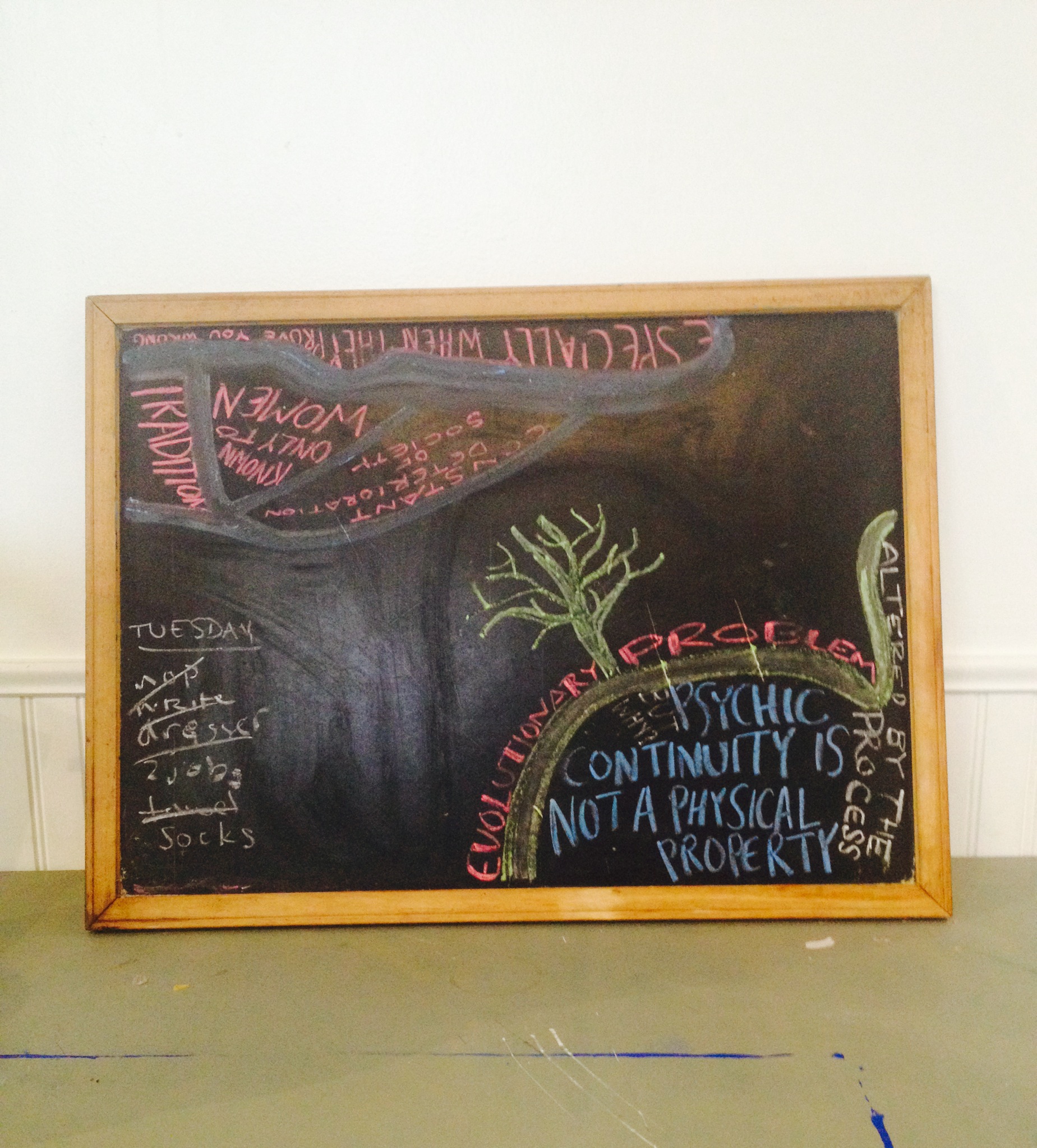 While it will never replace the chalkboard wall in my heart, this street find chalkboard serves the same purpose. And I present its first incarnation with a little inspiration from Michel Gondry and Noam Chomsky from “Is the Man Who is Tall Happy?”
