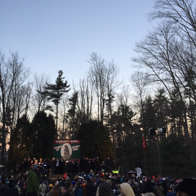 The pomp was cute, and the town smiling and alive for the pre-dawn festivities. The Knob, by the way, was a far stretch uphill from town center, and was more like a campground, with a snack bar, and several regional news teams set up with cheap coffee and hot chocolate. Onstage each live act was interspersed with the hits from the movie soundtrack, such as “Weatherman.”